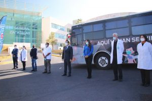 Con el compromiso de seguir apoyando al sector salud durante esta pandemia, el alcalde capitalino Ulises Mejía Haro dio el banderazo para la reactivación de la «Ruta Blanca» contra el COVID-19, una estrategia del Ayuntamiento de Zacatecas que brinda transporte gratuito al personal médico con el objetivo de generar mejores condiciones para quienes se encuentran en la primera línea de batalla contra el virus; con 4 autobuses en 9 rutas que cubrirán 15 Unidades Médicas y Hospitales públicos y privados ubicados en el eje metropolitano Zacatecas-Guadalupe.