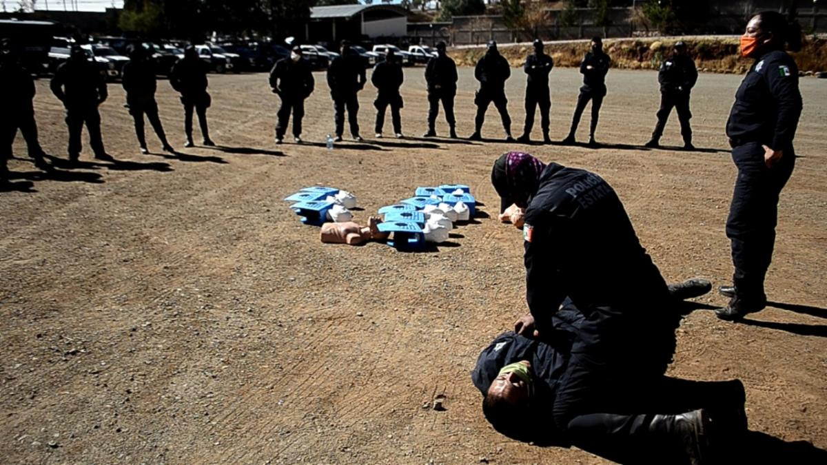 A fin de fortalecer las capacidades de reacción y actuación de los cuerpos de seguridad, elementos de la Policía Estatal Preventiva (PEP) participan en un curso de primeros auxilios.