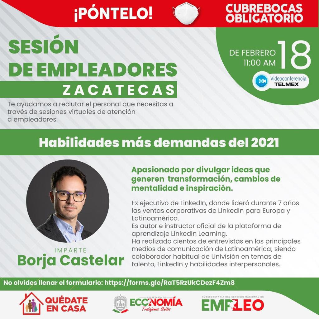 En está ocasión, el conferencista será Borja Castelar, quien abordará el tema de Habilidades con más Demandas del 2021, con ideas que generen transformación, cambios de mentalidad e inspiración.