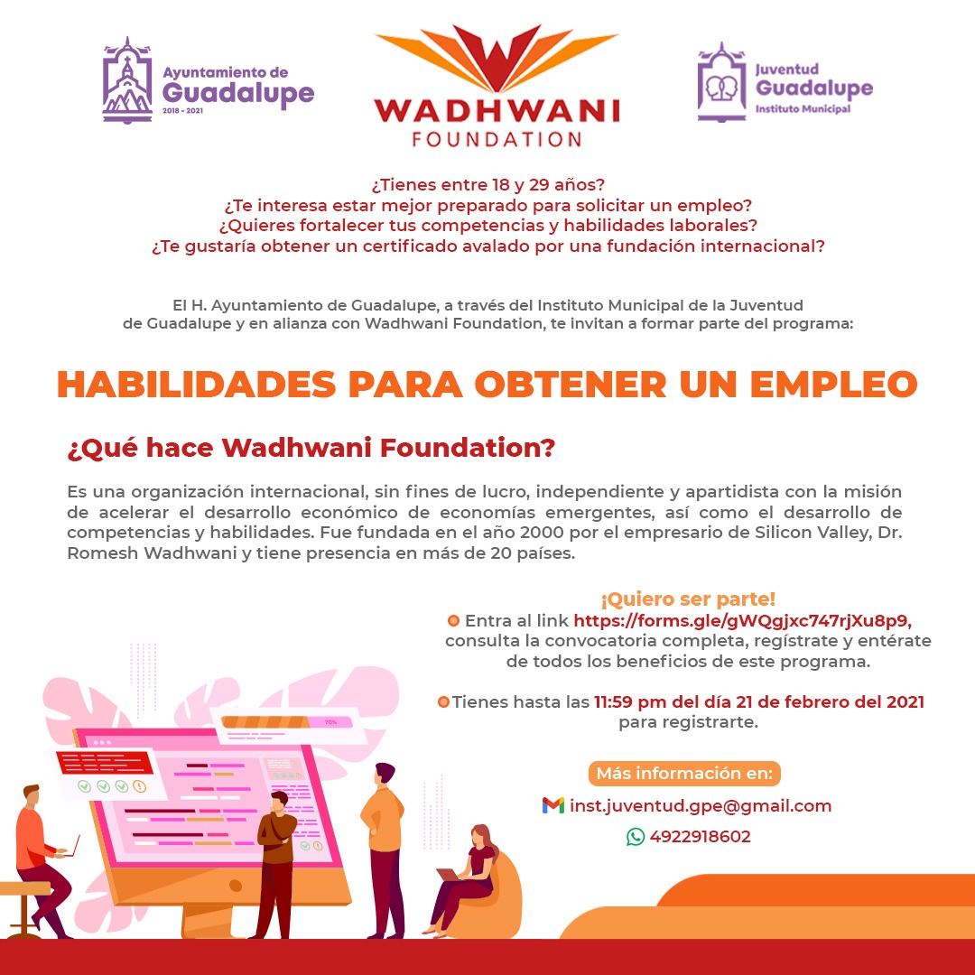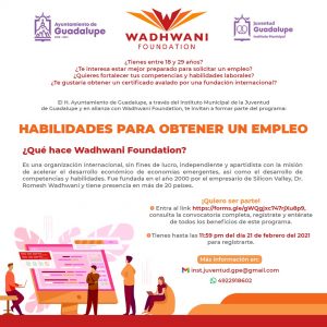 Como resultado de la alianza entre el Ayuntamiento de Guadalupe y la fundación internacional Wadhwani, con sede en la India y con presencia en más de 20 países, los jóvenes guadalupenses podrán participar en el programa ‘Habilidades para Obtener un Empleo’, mediante el que se pretende que incrementen sus competencias y habilidades laborales.