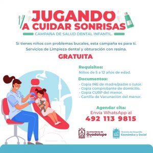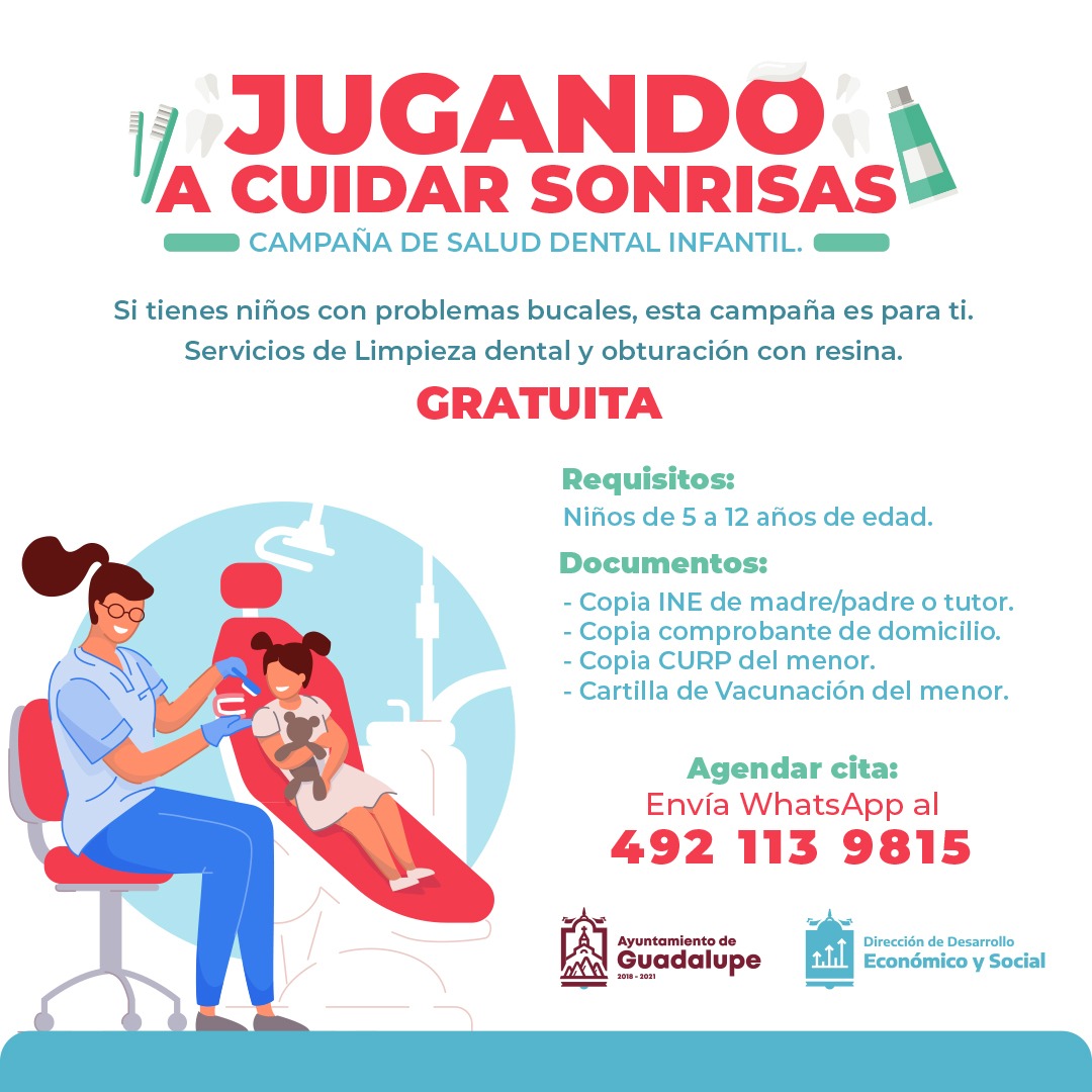 Con el objetivo de que los niños guadalupenses retomen los cuidados de salud ofrecidos por los especialistas en las escuelas, el Ayuntamiento de Guadalupe anuncia la campaña permanente de salud dental infantil denominada ‘Jugando a cuidar sonrisas’, coordinada por la Dirección de Desarrollo Económico y Social, a través de la Unidad de Salud del municipio.