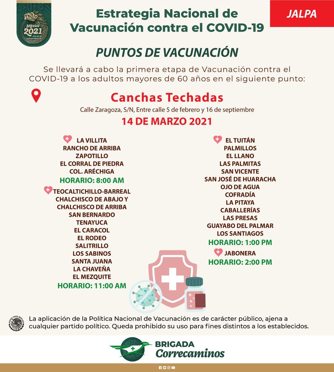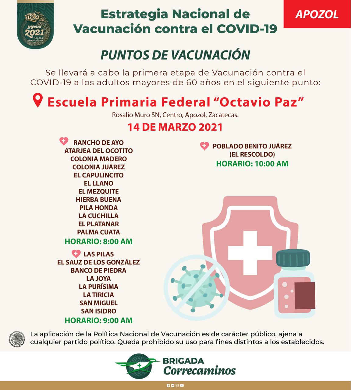 En los municipios de Apozol y Jalpa, este domingo 14 de marzo inicia la aplicación de la vacuna contra el Covid-19 para los adultos mayores de 60 años.