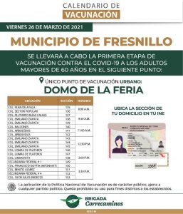 A partir del viernes 26 de marzo, iniciará la vacunación a población adulta mayor de 60 años del municipio de Fresnillo, conforme al programa establecido en el Plan Nacional de Vacunación contra el virus SARS-Cov 2.