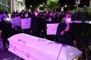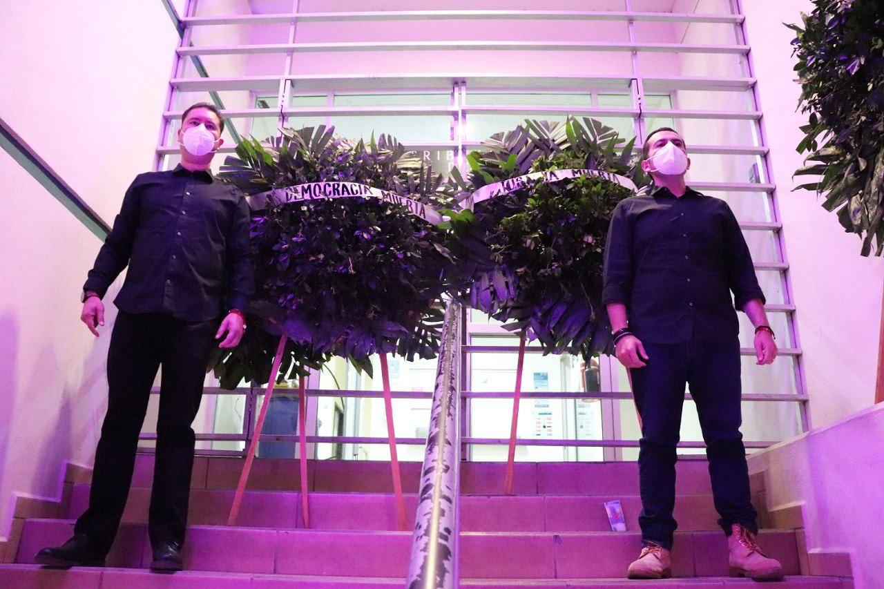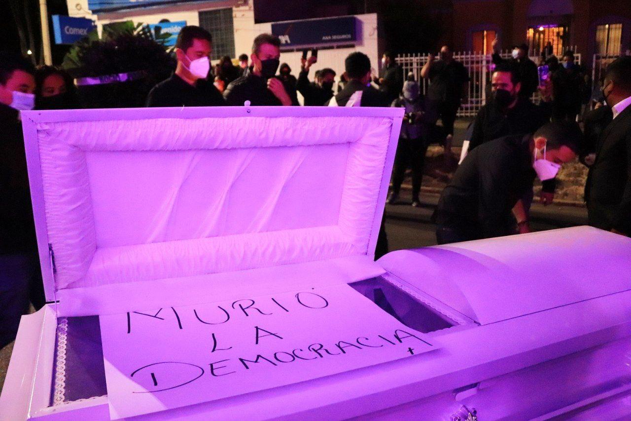 Durante su presencia en el TRIJEZ, y acompañados de ambos, la gente colocó coronas y pancartas alusivas a la muerte de la justicia electoral y la democracia en Zacatecas. Con música fúnebre de fondo se entonaron consignas como “la justicia y la democracia están de luto”, “Árbitro electoral imparcial y rehén de una familia”, esto ante el desplazamiento de perfiles competitivos en todo el Estado de Zacatecas.