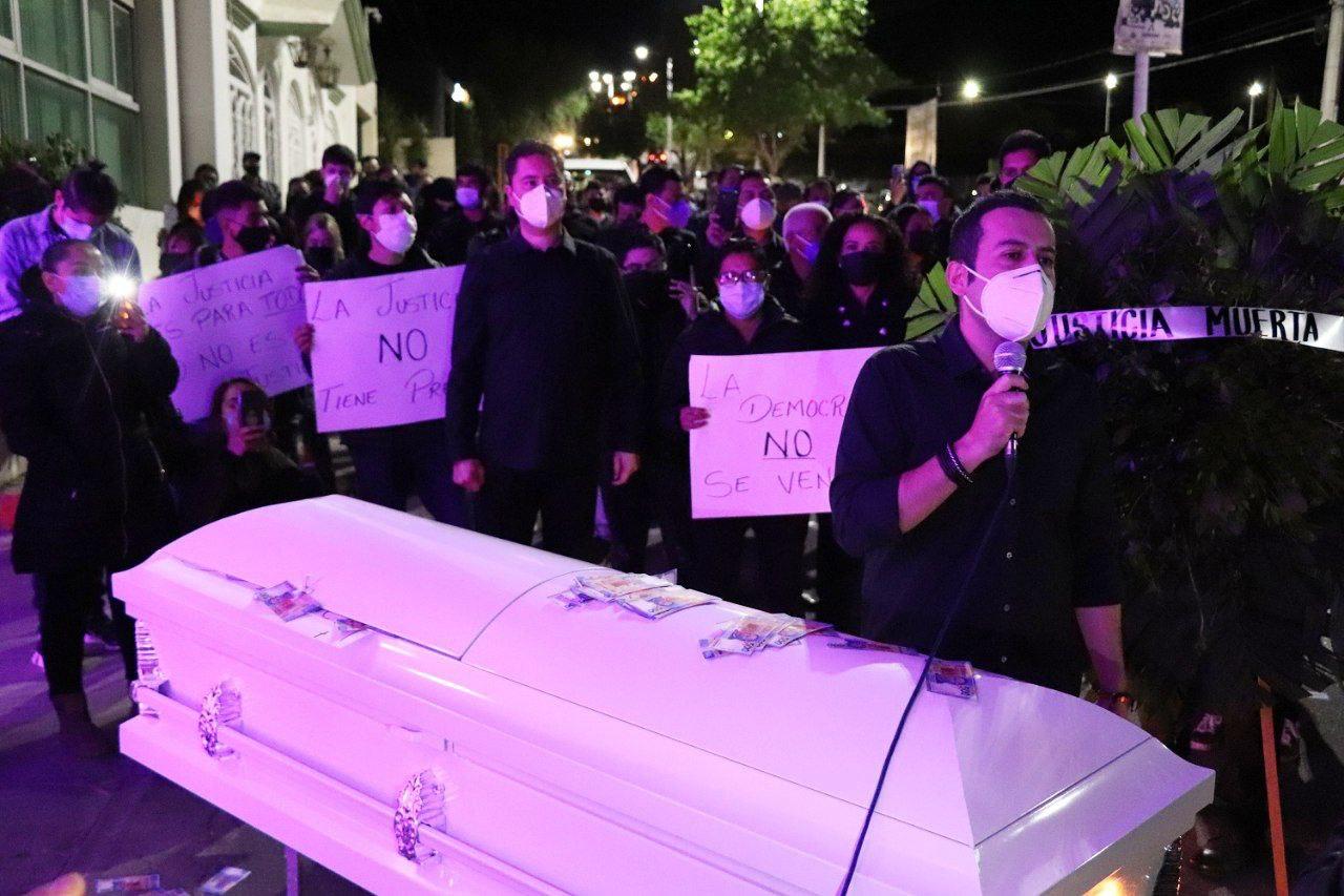 Esta noche de sábado, capitalinos se manifestaron en las instalaciones el Tribunal de Justicia Electoral del Estado de Zacatecas (TRIJEZ), por la dignidad, la justicia y la democracia, luego de que dicha instancia sancionara de manera injustificada y con total parcialidad a Ulises Mejía Haro e Iván de Santiago. Ambos comentaron a comunicadores de la entidad y otros ciudadanos que se trata de otro intento por frenar las aspiraciones legítimas de cara a la contienda electoral y para callar voces críticas frente a la imposición.