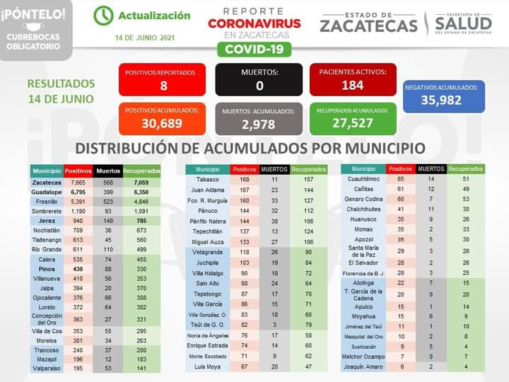 De esta forma, se informó que en Zacatecas se han registrado 30 mil 689 contagios, de los cuales, se han recuperado 27 mil 527 casos y han perdido la vida 2 mil 978 personas.