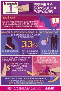Asimismo, el pasado 18 de junio se emitió la convocatoria para que la ciudadanía interesada participe como observadora de la Consulta Popular a celebrarse el 1º de agosto de 2021, la cual estará abierta hasta el 15 de julio de 2021, periodo durante el cual las y los interesados podrán registrarse en línea a través del portal electrónico y de manera presencial en las sedes de las Juntas Locales y Distritales Ejecutivas del Instituto.