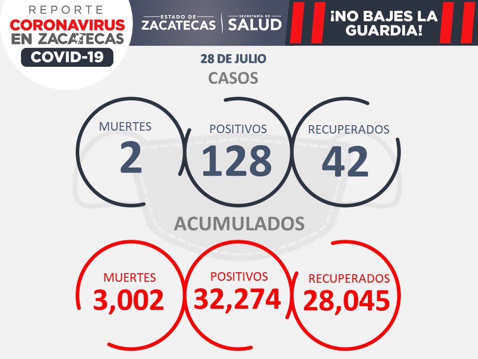 Los contagios de COVID-19 van a la alza en Zacatecas. Este miércoles la Secretaría de Salud estatal reportó 128 nuevos casos, con los que la entidad alcanza un acumulado de 32 mil 274. Además, en las últimas 24 horas, fallecieron dos personas.
