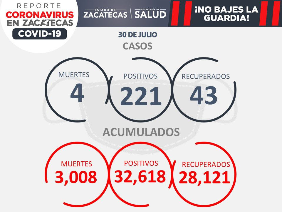 Zacatecas acumula 32 mil 618 casos de Coronavirus desde el inicio de la pandemia, 28 mil 121 recuperados y 3 mil 008 muertes.