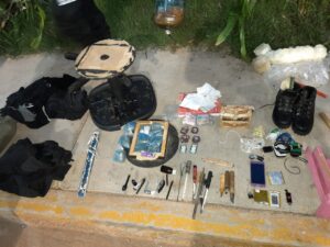 Así como cuatro cargadores para celular con cables completos, dos manos libres, un cable de teléfono, una máquina de tatuar hechiza, 10 pipas hechizas, ocho puntas, tres charrascas, ocho prendas de vestir color negro, cinco pesas hechizas y 20 litros de líquido fermentado.