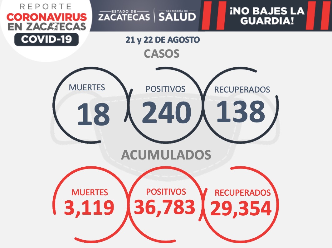 La Secretaría Salud de Zacatecas (SSZ) reportó que, durante el fin de semana, se registraron 240 nuevos contagios de COVID-19, 138 recuperados y 18 defunciones. Desde el inicio de la pandemia en la entidad 36 mil 783 se han contagiado de Coronavirus; de ellos 29 mil 354 se han recuperado y 3 mil 119 fallecieron.