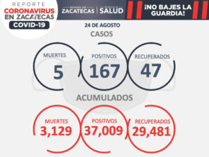 Con los 167 nuevos contagios de COVID-19 que reporta hoy la Secretaría Salud de Zacatecas (SSZ), el estado alcanzó el acumulado de 37 mil 009 en lo que va de la pandemia ocasionada por el virus Sars-CoV-2. Este martes, una familia zacatecana perdió a un niño de 7 años a causa de la enfermedad.