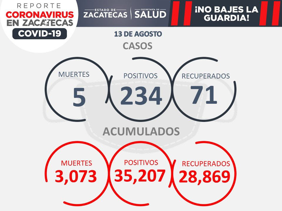 Este viernes, la Secretaría de Salud de Zacatecas (SSZ) reportó 234 nuevos contagios de COVID-19 y cinco fallecimientos, entre ellos el de una pequeñita de 1 año de edad; también, 71 pacientes se recuperaron del SARS-CoV-2.