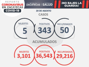 Por segunda ocasión en este mes de agosto, Zacatecas registra 343 casos de contagio de COVID-19, cifra más alta desde el inicio de la pandemia. Además, este viernes, la Secretaría de Salud de Zacatecas (SSZ) reportó la recuperación de 50 pacientes y la defunción de cinco más.