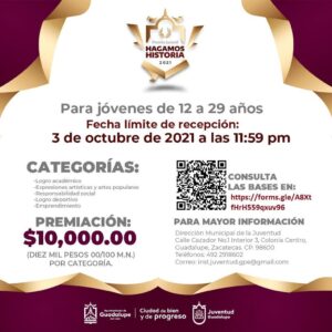 Con un premio de 10 mil pesos para cada una de las 5 categorías, a través de la Dirección Municipal de la Juventud, el Ayuntamiento de Guadalupe que preside Julio César Chávez Padilla, convoca a participar en el Premio Juvenil Hagamos Historia 2021.