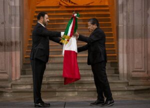 Siguiendo el protocolo, tras los honores a la bandera, el gobernador saliente, Alejandro Tello Cristerna entregó la enseña nacional al gobernador entrante David Monreal Ávila, quien posteriormente entregó el lábaro patrio a la escolta de la Policía Estatal, que a partir de hoy estará bajo su mando.