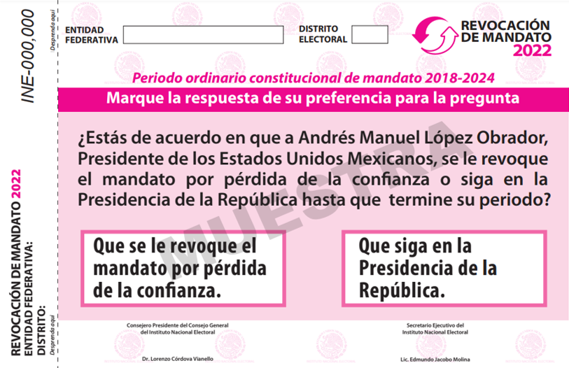 La Comisión Temporal de Seguimiento de los Procesos Electorales Locales 2021-2022 del Instituto Nacional Electoral (INE), aprobó por unanimidad el diseño y la impresión de la papeleta, documentación, materiales, así como el líquido indeleble que se utilizará para impregnar el dedo pulgar derecho de las personas participantes durante la Revocación de Mandato.
