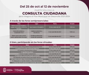 El lunes 8 de noviembre, también de manera virtual, se llevará a cabo el foro de consulta de Desarrollo económico local y promoción turística; mientras que el martes 9 será el de Ciudad ordenada, infraestructura e innovación municipal; el miércoles 10 de noviembre el de Adaptación al cambio climático y diversidad biológica, y el jueves 11 de Alianzas para la gobernanza y el desarrollo municipal.