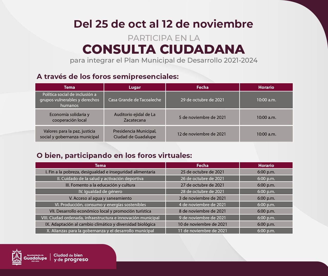 A estos foros están convocados todas y todos los guadalupenses, representantes de organizaciones públicas, privadas o de la sociedad civil interesados en participar en la consulta ciudadana para la formulación del Plan Municipal de Desarrollo 2021-2024.