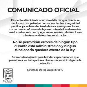 En este sentido, Córdova Longoria señaló que “la población nos eligió para que las cosas se hagan bien, por lo que no vamos a dejar que esto pase desapercibido, por lo que le pedimos a la ciudadanía de Río Grande, que tenga confianza de que estamos actuando, y armando una estrategia para reforzar la corporación, puesto que es vital que sea una dirección íntegra”.