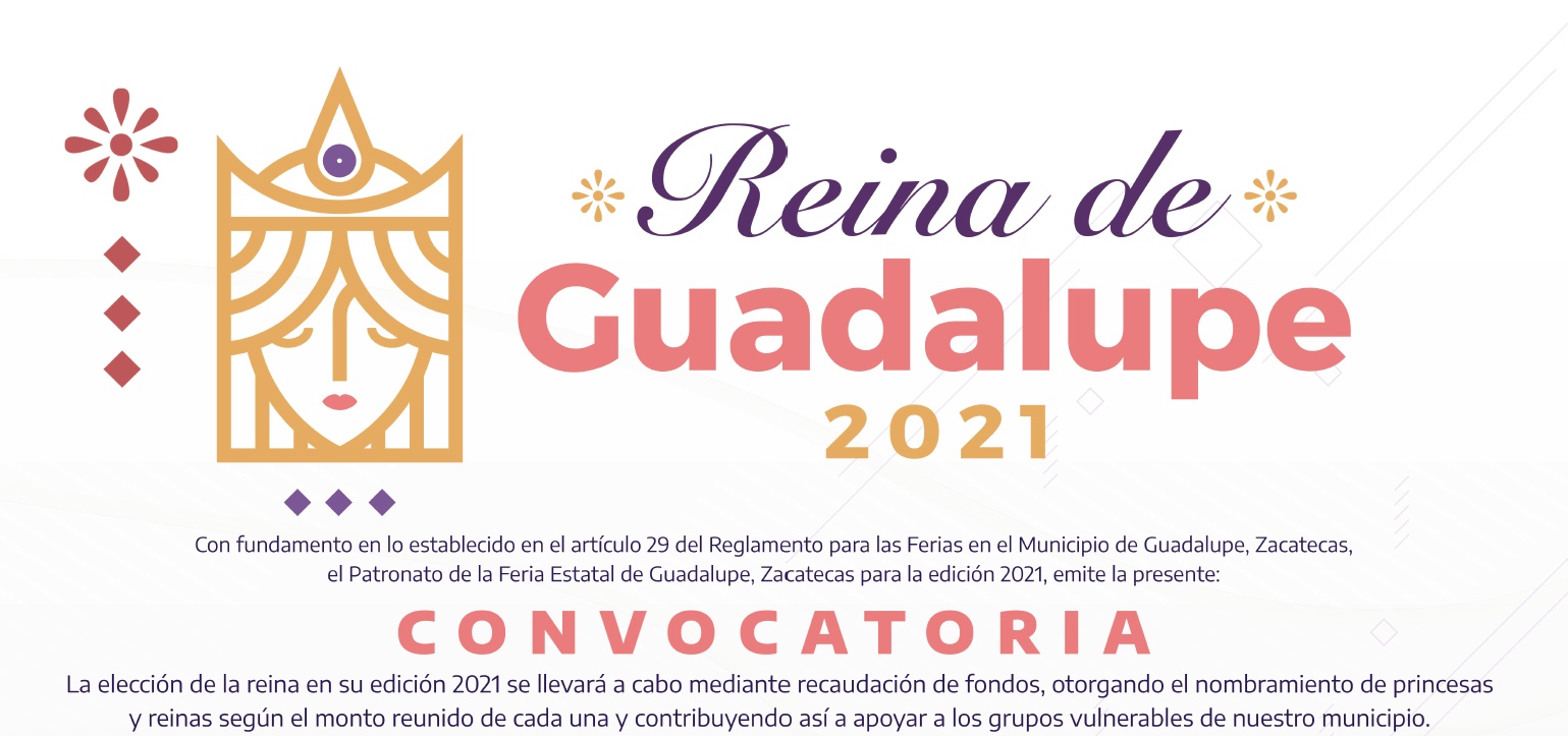 El Ayuntamiento de Guadalupe, que preside Julio César Chávez Padilla, a través de la Secretaría de Gobierno Municipal, y de la Dirección Municipal de la Juventud, emitieron la convocatoria para elegir a la Reina de la Feria Estatal de Guadalupe en su edición 2021, considerando el principio de inclusión que garantiza la no discriminación para ninguna participante.