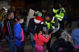 Después de que el personal de Protección Civil Municipal brindara cubrebocas y gel antibacterial a los asistentes, los payasos Kachín y Fokín provocaron carcajadas entre chicos y grandes, mientras que esperaron pacientes el arribo de la caravana que entrega los presentes a todos los guadalupenses.