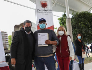 Acompañado por las secretarias de Desarrollo Urbano, Vivienda y Ordenamiento Territorial y de Educación, Laura Bermúdez y Maribel Villalpando, así como de los alcaldes de Jalpa y Apozol, Noé Esparza Martínez y Gabriela Arellano, y de la subdelegada de Programas para el Desarrollo en Zacatecas, Coraima Espinoza, el mandatario entregó 80 ayudas sociales, de 10 paquetes de cemento cada una.