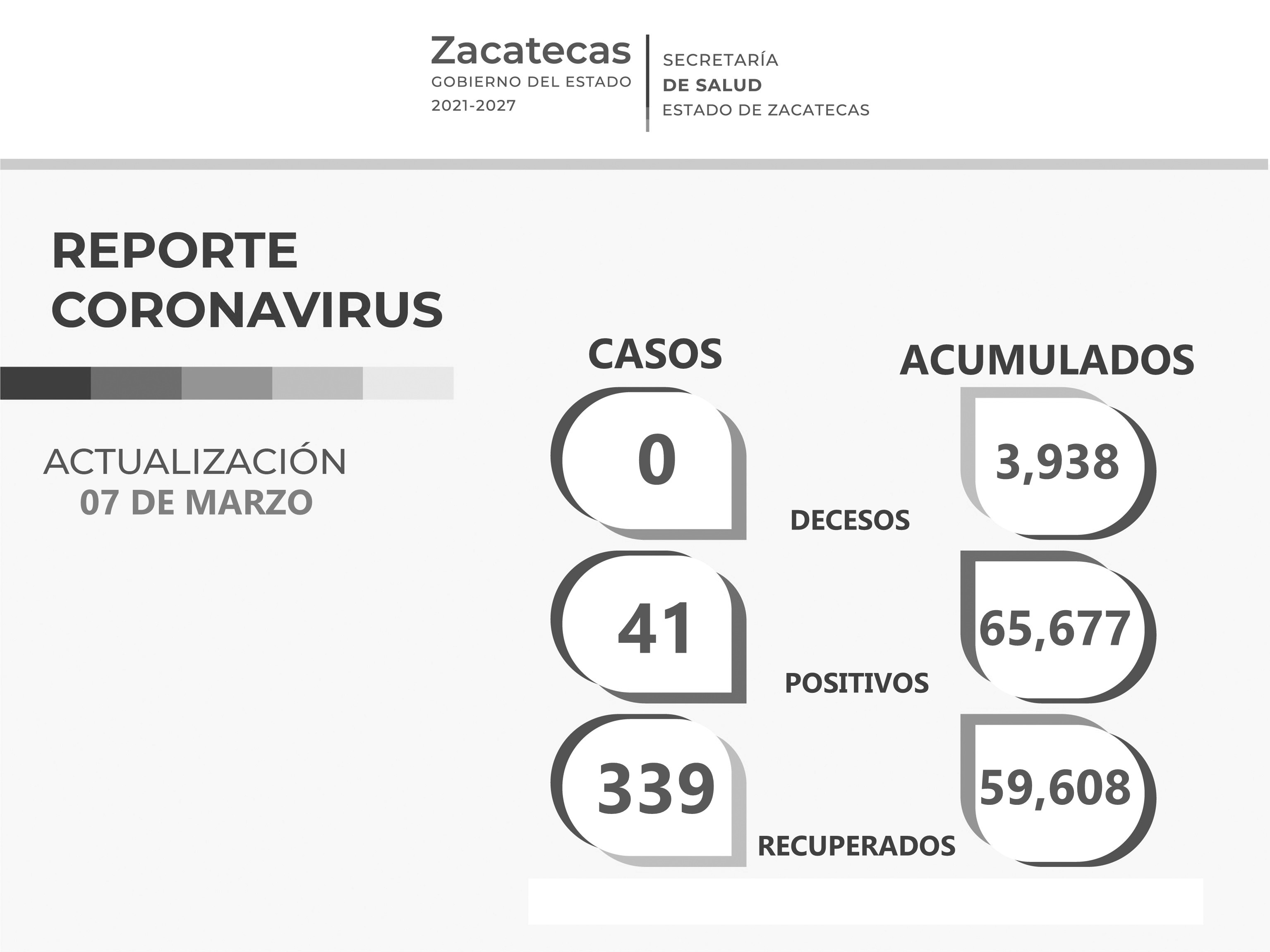 Por cuarto día consecutivo, la Secretaría de Salud de Zacatecas (SSZ) no registró fallecimientos a causa de COVID-19 en el estado; en tanto, se reportaron 339 pacientes recuperados y 41 nuevos contagios.