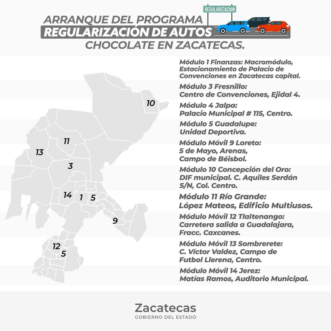 Dichos módulos estarán ubicados en los siguientes municipios en un horario de atención de lunes a sábado de 9:00 a 17:00 horas: Zacatecas, Macromódulo Estacionamiento del Palacio de Convenciones de Zacatecas; Guadalupe, Unidad Deportiva de Guadalupe; Fresnillo, Centro de Convenciones, Ejidal 4, Fresnillo, Zacatecas.