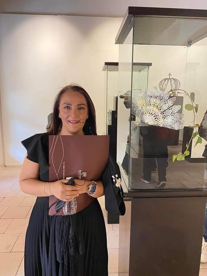 Luz María Enciso Alcalá, artista del municipio de Río Grande obtuvo la distinción de “Cantera y Plata 2022” en la categoría diseño en joyería con la pieza Valeria, la cual consiste en un abanico inspirado en el herraje zacatecano y rosetones.