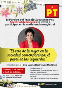 Dentro de nuestras actividades, tenemos programada para este próximo viernes 11 de marzo una conferencia magistral de la Dra. Lupita Rodríguez Martínez, integrante de la Comisión Coordinadora Nacional de nuestro partido y líder nacional del Sectorial de Mujeres, que lleva el nombre «El reto de la mujer en la sociedad contemporánea: el papel de las izquierdas». La misma se desarrollará en punto de las 5 de la tarde a través de la plataforma Zoom.