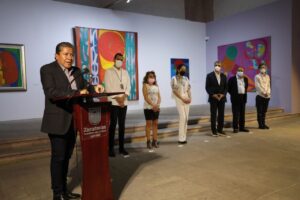 El Gobernador de Zacatecas estuvo acompañado de Luisa Jaina Coronel Dávila, hija de Pedro Coronel; Miguel Fernández Felix, director del Museo del Palacio de Bellas Artes, quienes tuvieron una destacada y emotiva intervención; así como del Secretario de Turismo, Le Roy Barragán Ocampo; el director del Sistema Estatal de Museos, Uriel Márquez Romo, e Iñaki Herranz, curador de la exposición.