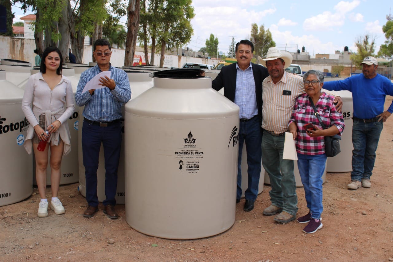 Acompañado de la regidora Kelly Samaniego, de Chanita Ramírez Díaz y del ingeniero Eleno Samaniego, en el Campo Azteca de la cabecera municipal, el diputado Femat Bañuelos hizo entrega de 40 tinacos de 1100 litros para favorecer a pobladores de ocho comunidades y nueve colonias de la cabecera municipal.