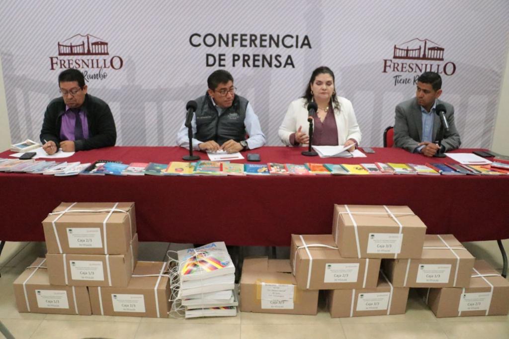 Fresnillo, Zac.- El trabajo coordinado entre el Municipio y el Estado está dando resultados para el beneficio de los fresnillenses. Este miércoles, en conferencia de prensa, la Coordinación Estatal de Bibliotecas realizó la donación de 11 colecciones de libros para cada una de las bibliotecas, así como una colección de 121 libros en braille para estudiantes de primaria y secundaria con discapacidad visual.