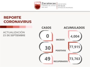 A la fecha, Zacatecas contabiliza a 73 mil 763 personas que superaron al COVID-19 y 77 mil 915 que fueron confirmadas como positivas a la enfermedad causada por el virus SARS-CoV-2. La Secretaría de Salud de Zacatecas (SSZ) informó que, este viernes son 49 zacatecanos quienes se encuentran en la primera condición y 30 en la segunda.