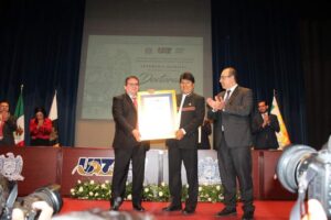 Correspondió entonces tomar la palabra al condecorado, tras recibir físicamente el título especial con el nombramiento de Doctorado Honoris Causa, de manos del rector Rubén Ibarra Reyes y de Ángel Román Gutiérrez, secretario general de la Universidad.
