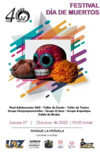 La responsable del Programa Transversal de Extensión, Creación y Difusión Artística, de la Unidad Académica de Artes de la Universidad Autónoma de Zacatecas, Verónica Dávila Navarro, dio a conocer la realización de actividades artísticas y culturales en el parque La Peñuela, con motivo de la celebración del Día de Muertos.