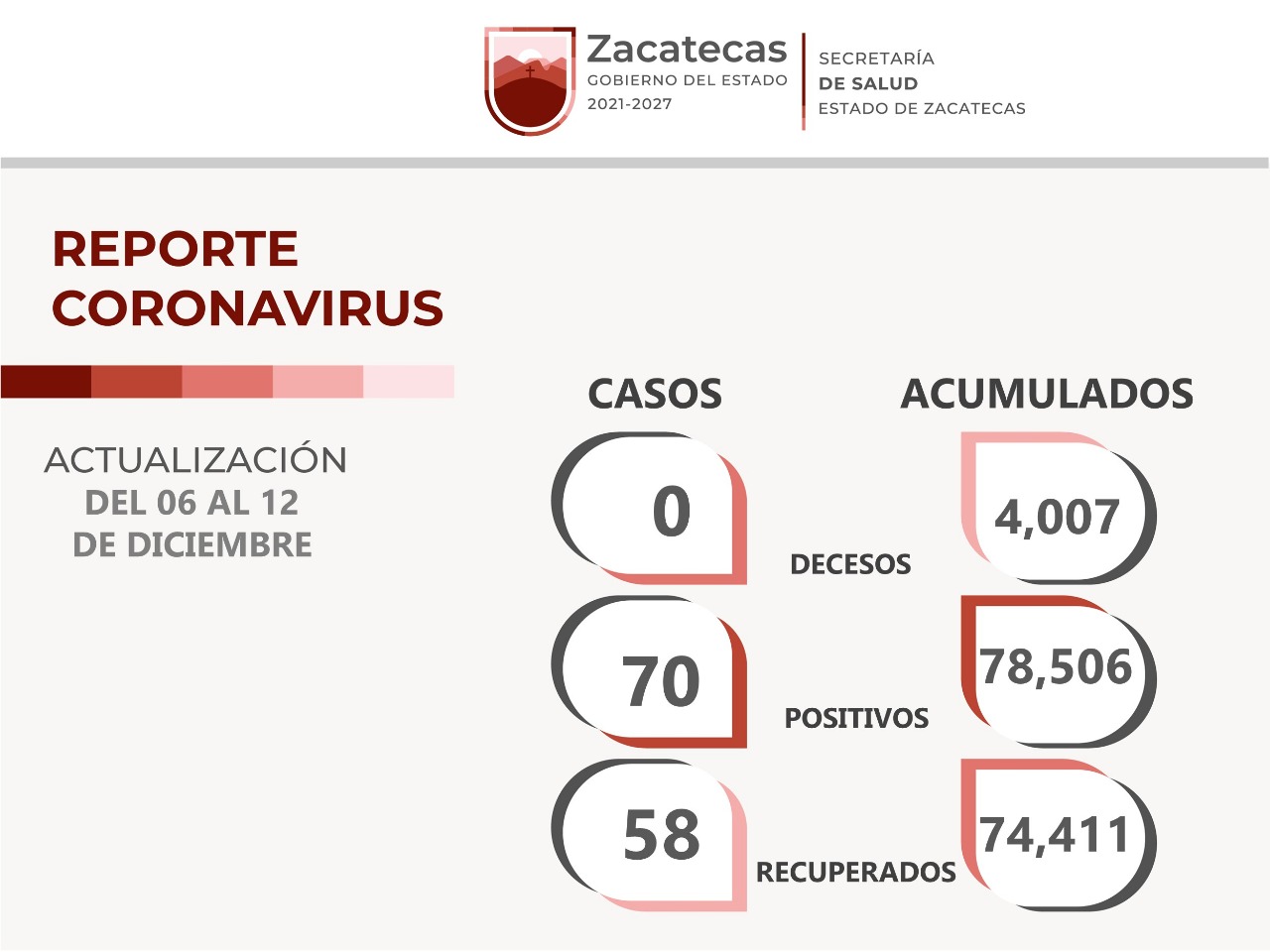Nuevamente, Zacatecas pasa una semana sin registrar defunciones por COVID-19, de acuerdo al reporte de la Secretaría de Salud de Zacatecas (SSZ), correspondiente a la semana del 6 al 12 de diciembre. Asimismo, se informa que contabilizaron a 58 personas recuperadas y 70 nuevos casos.