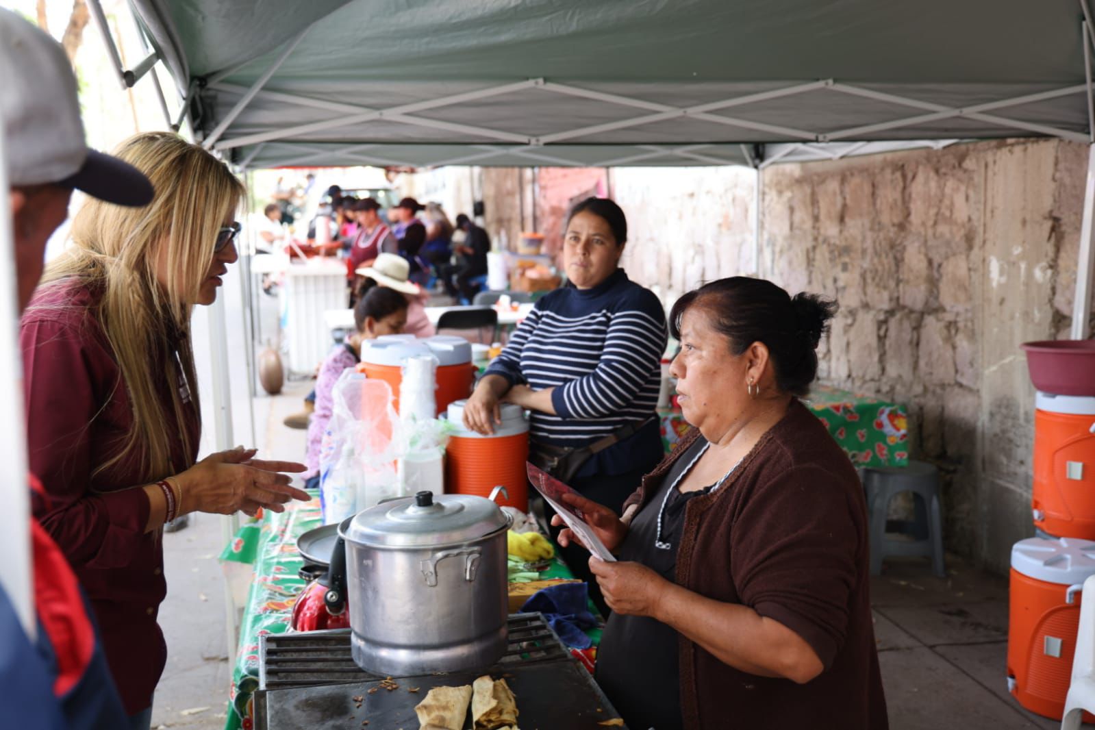 Acompañada por su equipo de trabajo y distintos coordinadores, Julia Olguín dialogó con los comerciantes que acuden al tianguis, quienes buscan mejorar su economía mediante el comercio en esta tradicional actividad.