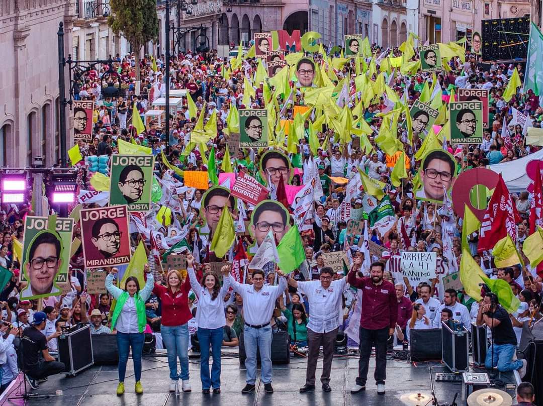 El candidato a presidente municipal de Zacatecas por el MORENA y el Partido Verde Ecologista de México, Jorge Miranda Castro, cerró a lo grande su campaña electoral con una reunión en el corazón de la ciudad.