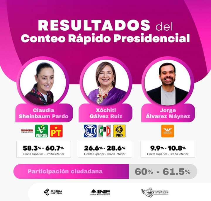 - Claudia Sheinbaum Pardo, de la coalición “Sigamos Haciendo Historia”, conformada por Morena, Partido del Trabajo (PT) y Partido Verde Ecologista de México (PVEM), obtuvo una votación que se ubica entre el 58.3 y el 7 %.