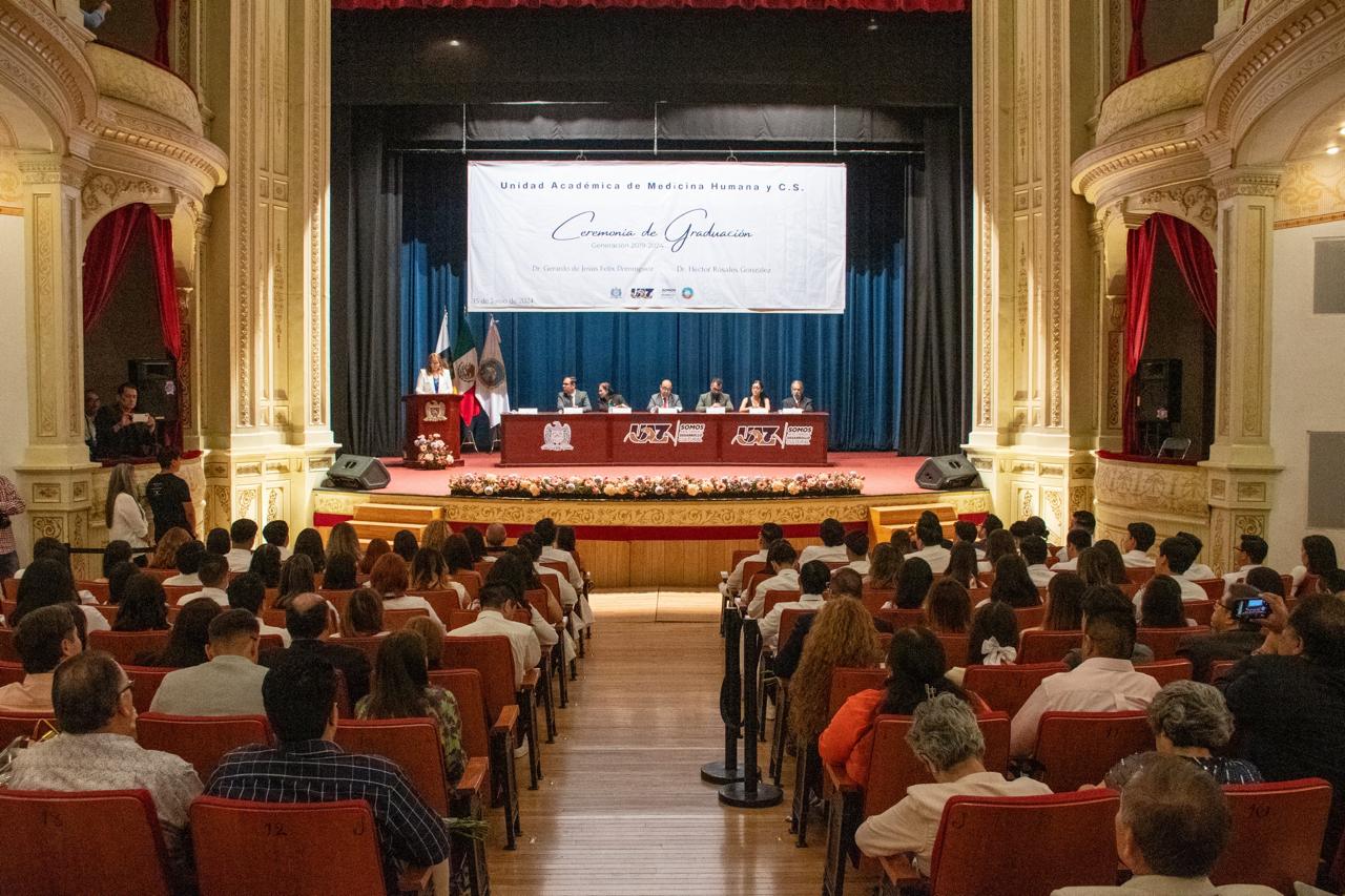 Ustedes se deben a sus pacientes, refirió la directora de la Unidad Académica de Medicina Humana y Ciencias de la Salud, Rosa Martha Covarrubias Carrillo , al dirigirse a los egresados del Campus Zacatecas y de la Extensión Fresnillo.