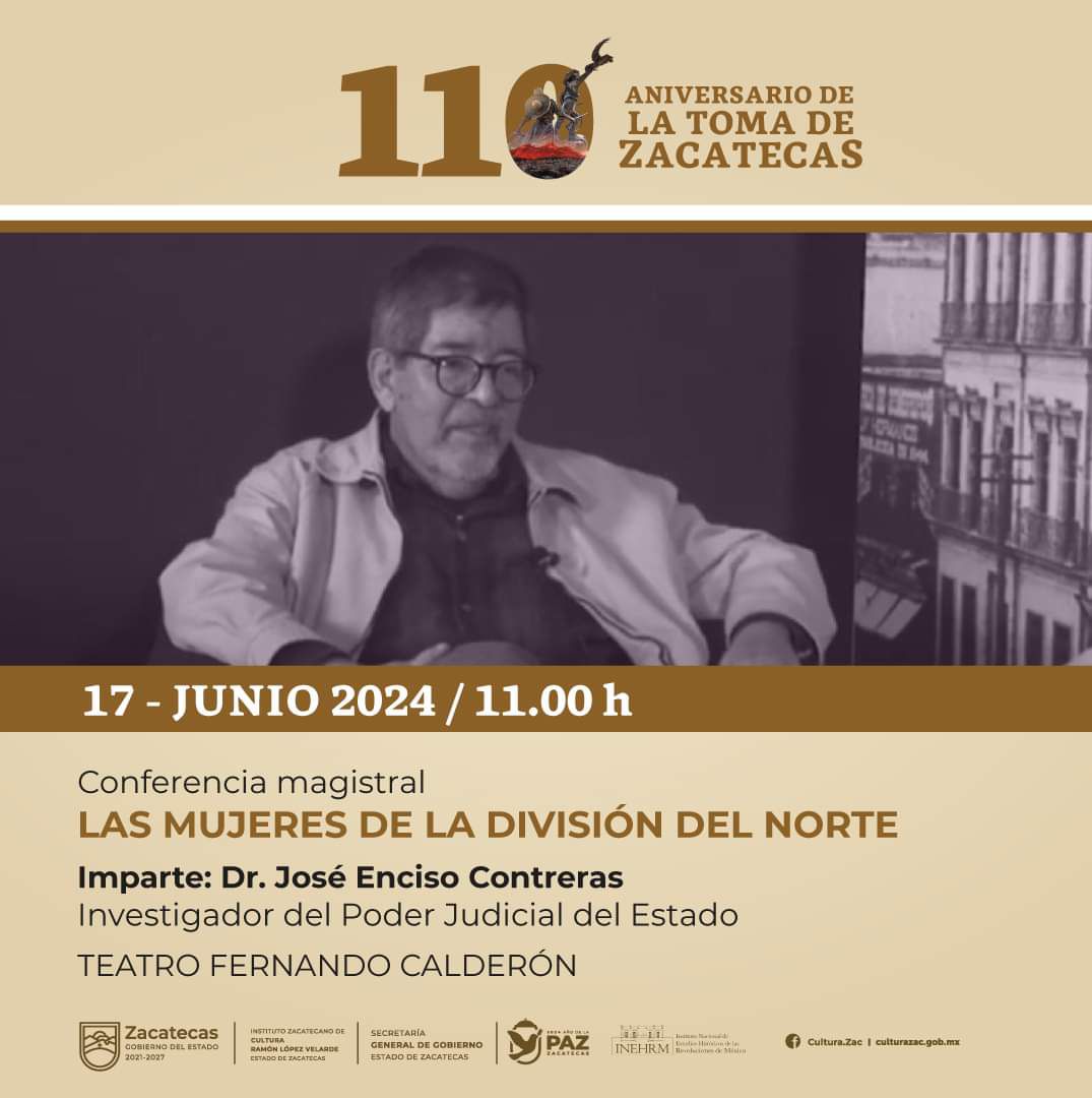 El académico universitario, José Enciso Contreras, tratará el tema de Las Mujeres de la División del Norte, donde abordará pasajes trascendentales de la Batalla de Zacatecas, desde su singular perspectiva, al ser uno de los que mayor dominio tiene en el tema.