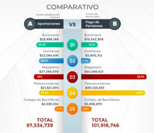 En el caso de la nómina de pensiones de 2 mil 033 pensionados que pertenecen al sector del Magisterio, se realiza un pago de 40 millones 586 mil 621 peso, de los cuales se recolectan de cuotas 8 millones 284 mil 214 pesos y en aportaciones del patrón se reúnen 19 millones 112 mil 456 pesos, que totalizan 27 millones 396 mil 670 pesos; ello arroja también un déficit en el pago de sus pensiones de 13 millones 189 mil 951 pesos, que también son completados con cuotas y aportaciones de otros cotizantes.