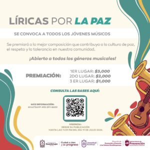 ‘Líricas por la Paz’, es una convocatoria abierta a todos los géneros musicales y se premiará a la mejor composición que enaltezca los temas de paz, respeto y tolerancia en nuestra comunidad.