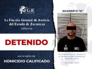 - Rigoberto “N”, fue detenido en el municipio de Fresnillo, Zacatecas, contaba con una orden de aprehensión por el delito de homicidio calificado.
