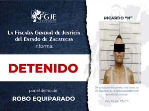 - Ricardo “N”, fue detenido en el municipio de Guadalupe, Zacatecas, contaba con orden de aprehensión por el delito de robo equiparado.
