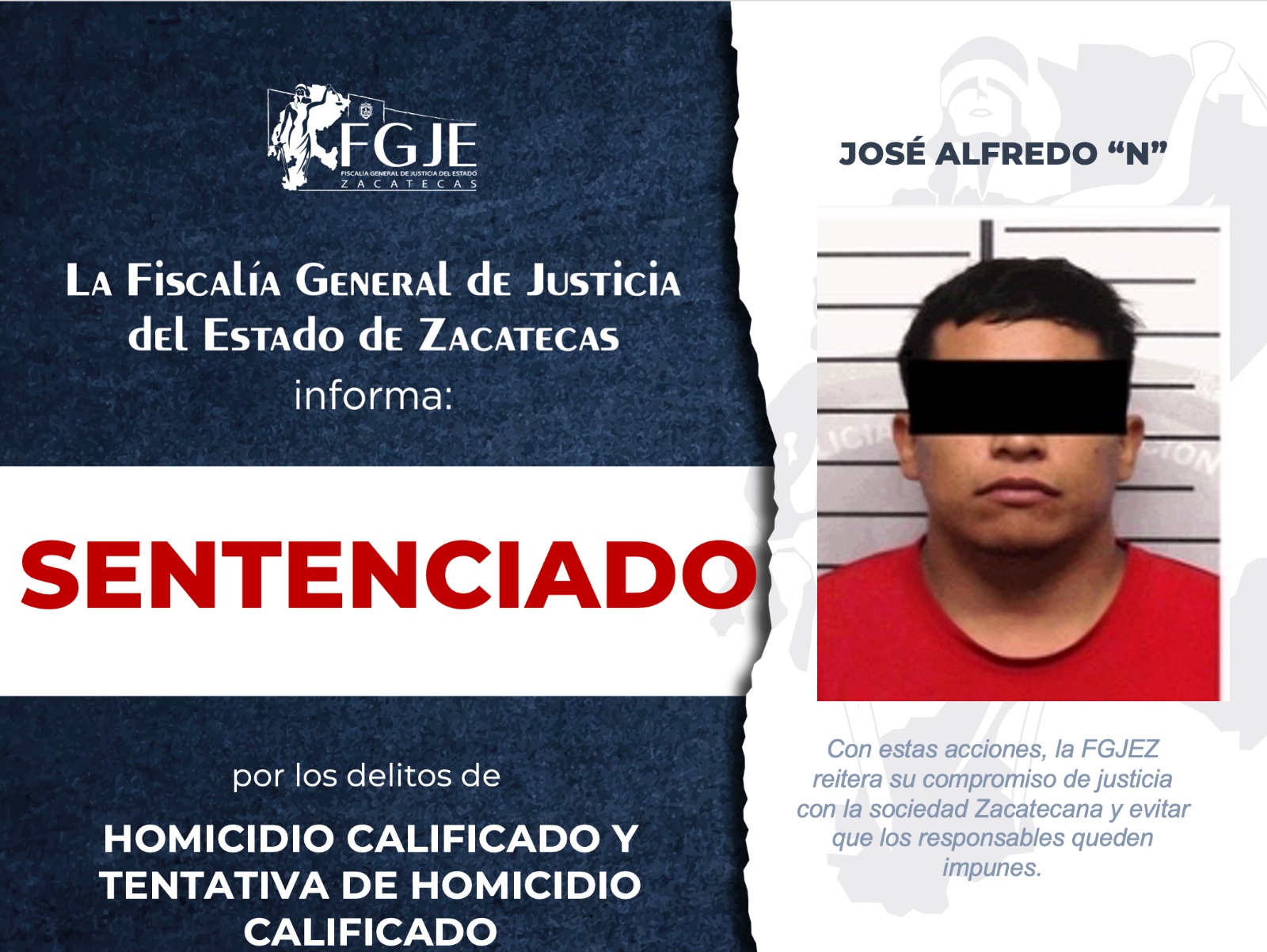 La Unidad de Homicidios Dolosos de la Vicefiscalía Distrital de Fresnillo, obtuvo sentencia condenatoria en contra de José Alfredo “N” por el delito de homicidio calificado y tentativa de homicidio calificado en perjuicio de dos personas.