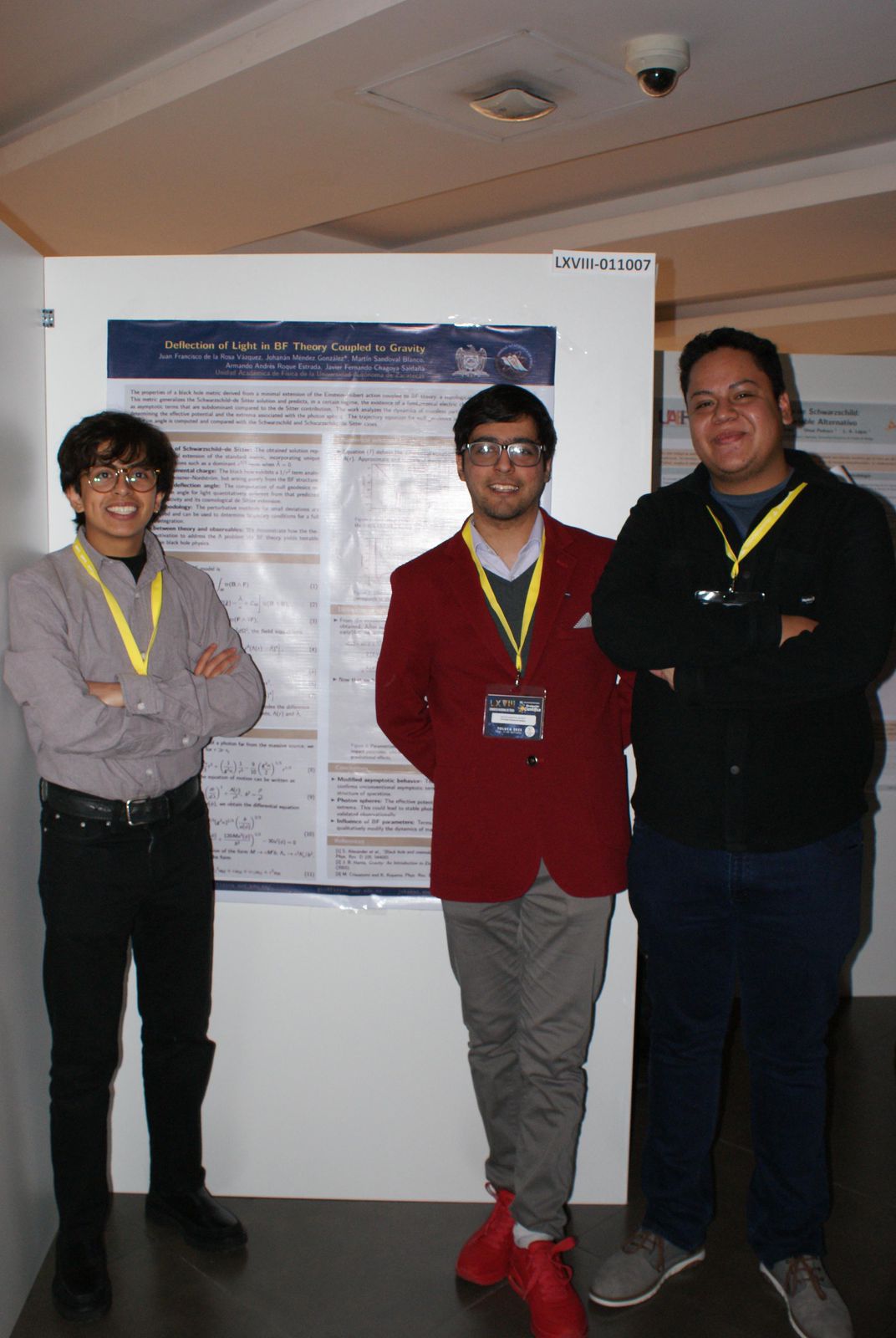 En esta edición, los estudiantes de la Licenciatura en Física de la Universidad Autónoma de Zacatecas (UAZ) Johanán Méndez González, Juan Francisco de la Rosa Vázquez y Martín Sandoval Blanco obtuvieron el primer lugar del Premio Carlos Graef en el área de Gravitación y Física Matemática.