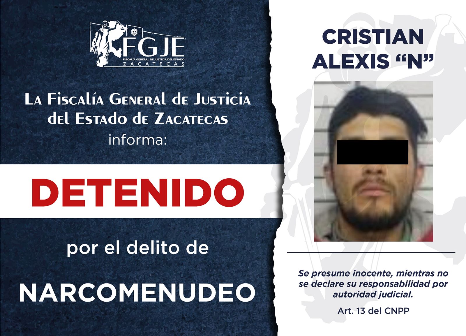 * Juan Manuel “N”, fue detenido en el municipio de Guadalupe, Zacatecas, contaba con una orden de aprehensión por los delitos de violación equiparada agravada en grado de tentativa. * Cristian Alexis “N”, fue detenido en el municipio de Guadalupe, Zacatecas, contaba con una orden de aprehensión por el delito de narcomenudeo.